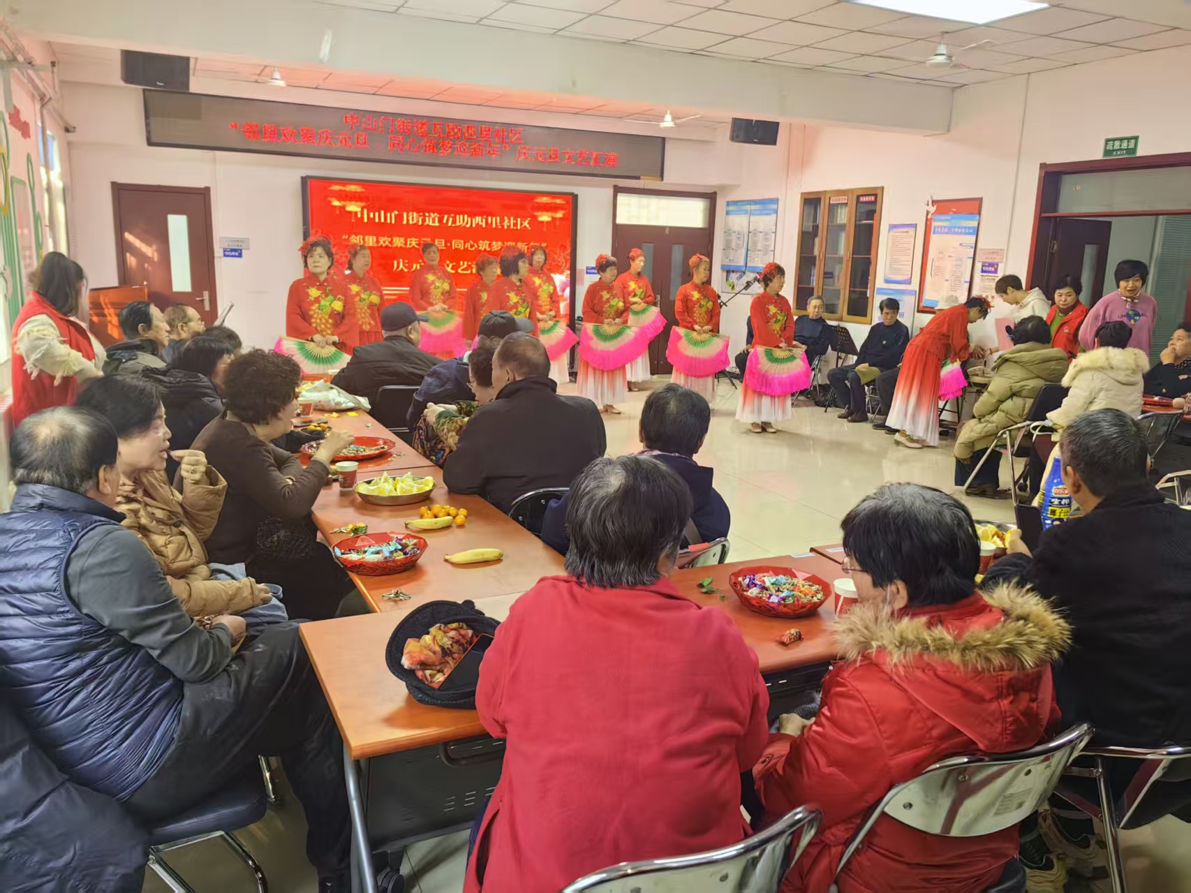 联欢会的现场处处洋溢着欢乐气息,社区的长者文艺队轮番登场:精致戏服搭配灵动扇舞,一招一式尽显传统韵味;红裙翩跹的舞蹈表演热情洋溢,将现场氛围推向高潮;还有民族风情的舞蹈、悠扬的器乐伴奏演唱,每一个节目都赢得台下长者们的阵阵掌声。大家围坐在一起,看得津津有味,欢笑声、喝彩声交织,小小的活动场地变成了欢乐的海洋。